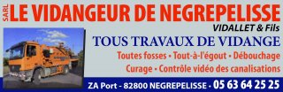 SARL LE VIDANGEUR DE NEGREPELISSEz.A. LE PORT82800 - NèGREPELISSE Clientèle visée : Particuliers - Professionnels DOMAINES D'INTERVENTION : Vidange / Curage de canalisation et de fosse
